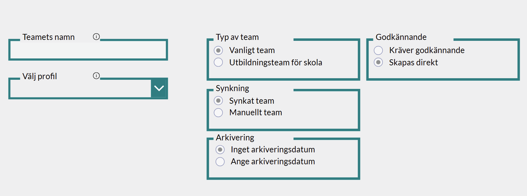 För skolorganisationer rekommenderar vi ett övergripande team för alla lärare för att dela material mellan skolor (materialbank). Detta team kan vi med hjälp av Teamsynk Organisation dynamiskt skapa så alla i organisationen automatiskt blir medlemmar i detta centrala förvaltningsteam.